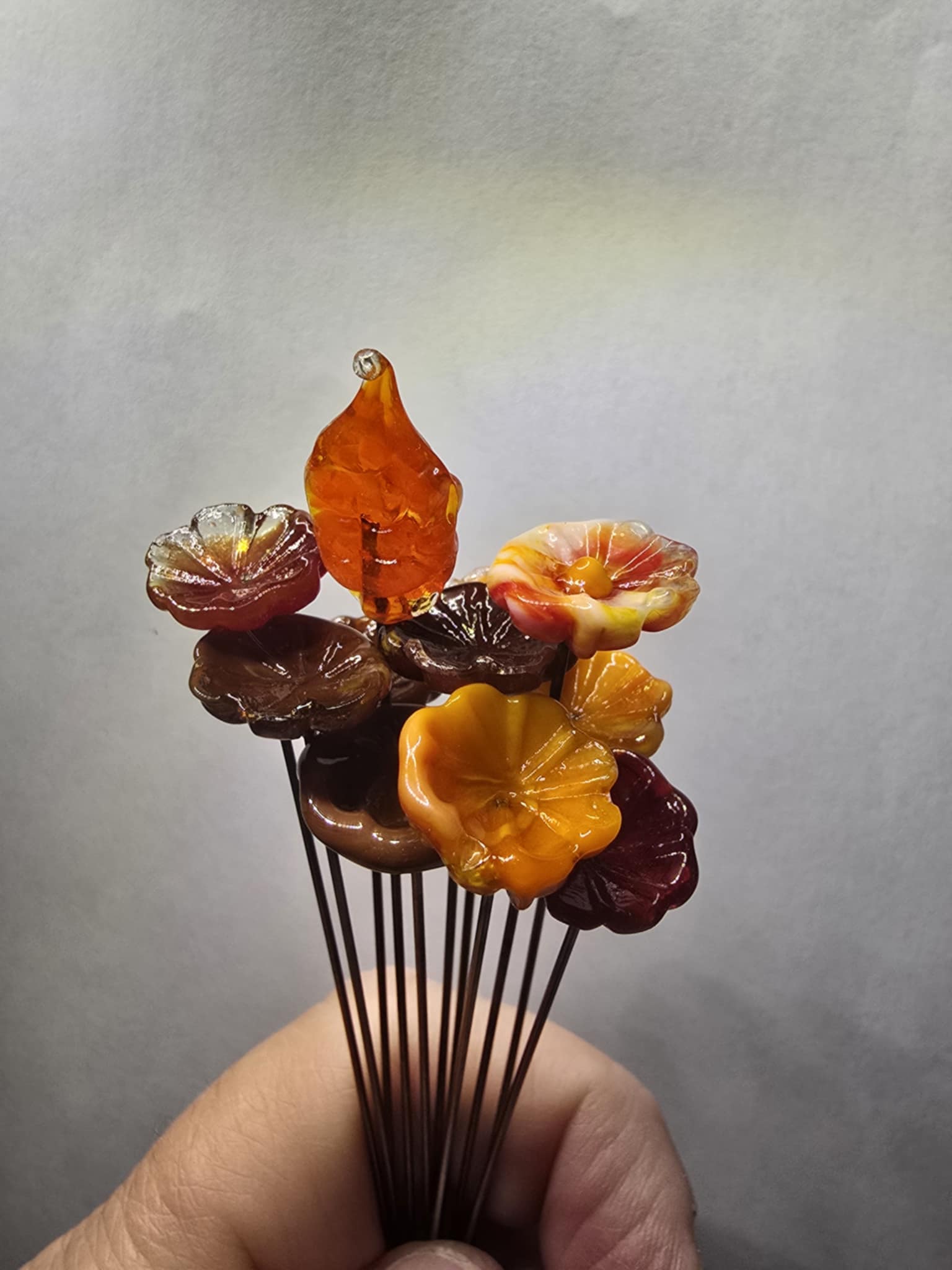 These glass flowers are tiny approximately 1/2" in diameter and they are beautiful! All my glass flowers are made in my shop in Georgia.